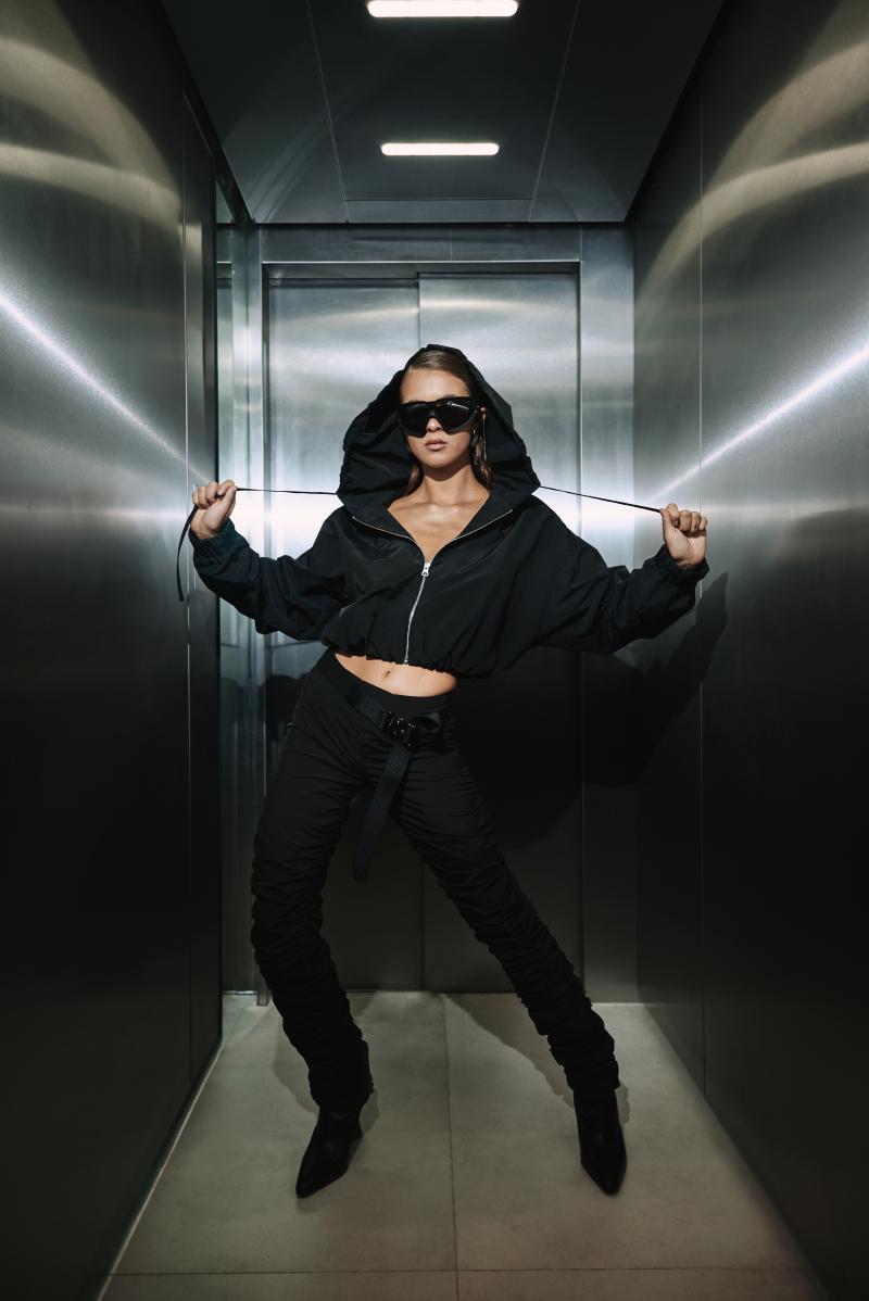 The sculptural oversized hood introduces an element of mystery, while the shortened silhouette emphasizes the waist and sharpens the body line.
