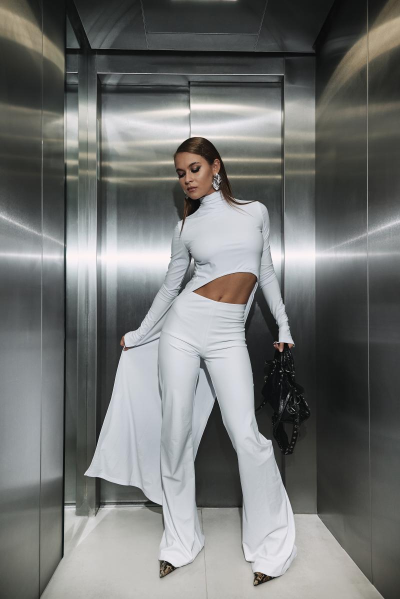High-waisted trousers designed to extend the line of the body with sculptural precision. The elongated cut and flare from the knee create a fluid vertical silhouette, balancing structure with movement.