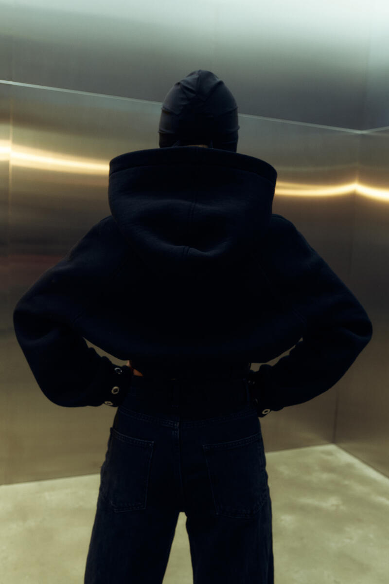 There are also distinct details: eyelets on the sleeves, a statement logo on the chest, and a belt that allows slight waist adjustment.
